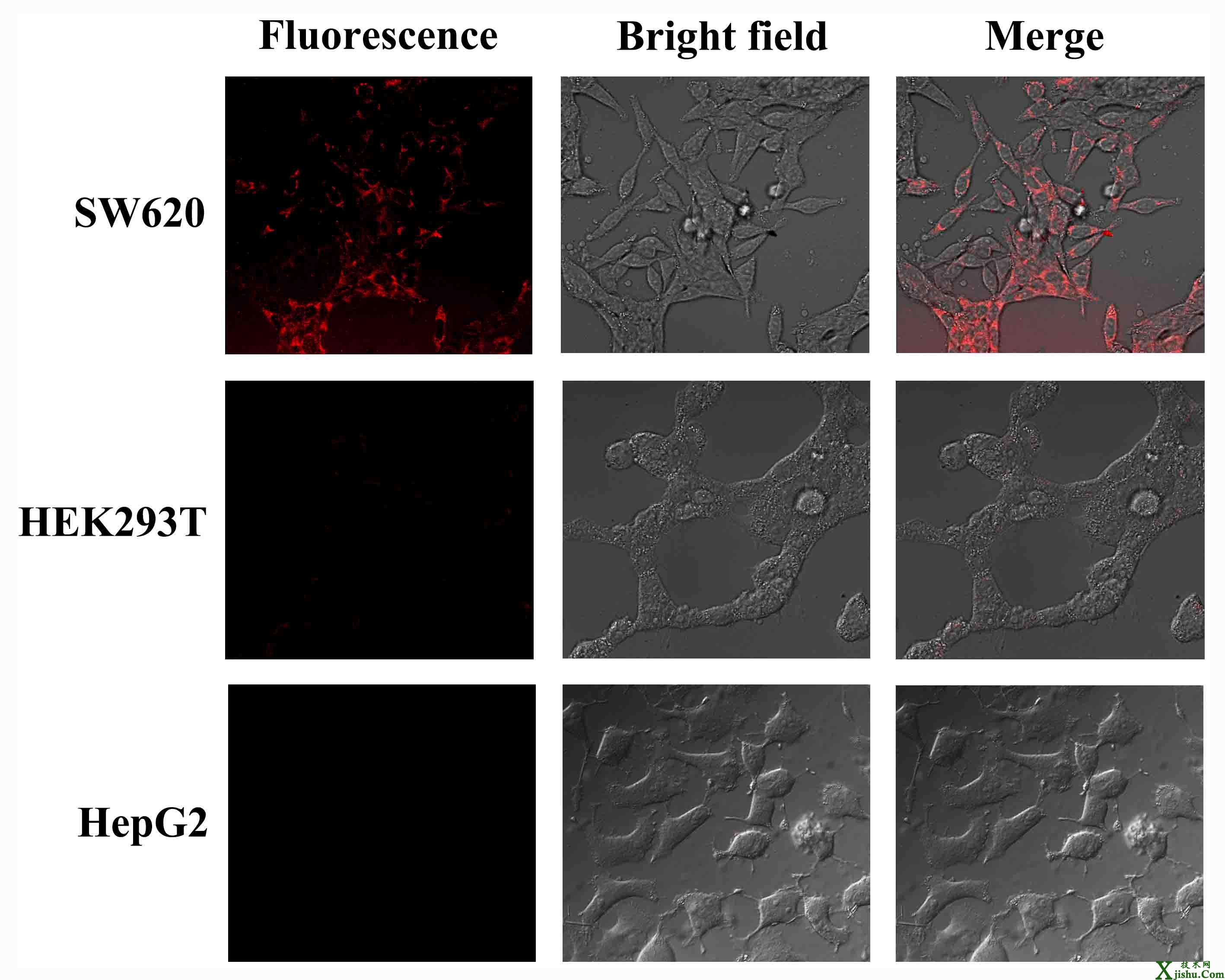 圖2. 靶標(biāo)細(xì)胞SW620和對照細(xì)胞(HEK29T和HepG2)與制備的仿病毒納米復(fù)合材料孵育后的激光共聚焦圖像