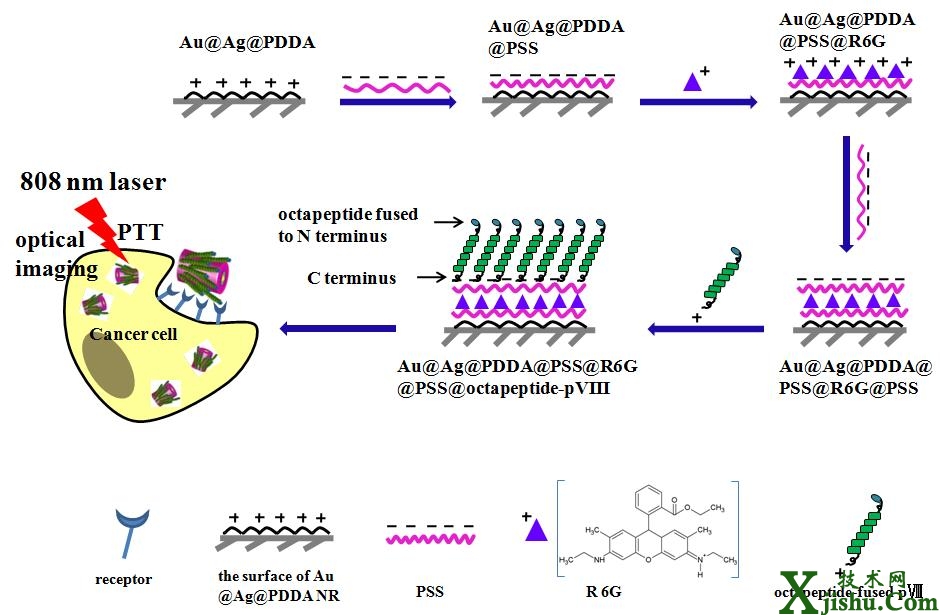 近日,中國科學(xué)院青島生物能源與過程研究所生物傳感技術(shù)團(tuán)隊(duì)博士生王菲等通過模擬噬菌體的組裝機(jī)理,利用層層自組裝技術(shù)構(gòu)筑了多功能仿病毒納米復(fù)合材料,實(shí)現(xiàn)了對結(jié)腸腫瘤細(xì)胞SW620的靶向熒光檢測和光熱殺傷。該成果在線發(fā)表于Scientific Reports (F. Wang, et al., Scientific Reports 2014, 4, 6080)。