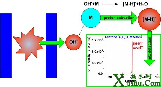 為了解決這個問題,光譜質(zhì)譜研究室科研人員另辟新徑,成功制備了負離子OH-,利用反應離子OH-與VOC之間的質(zhì)子反方向轉(zhuǎn)移反應,即質(zhì)子提取反應(PER),將被測物質(zhì)VOC轉(zhuǎn)化為(VOC-H)-,從而實現(xiàn)VOC的離子化和后續(xù)的質(zhì)譜探測;重要的是,OH-可以與無機化合物例如CO2發(fā)生反應,將無機物轉(zhuǎn)化為離子例如CO2OH-。因此,新發(fā)展的以OH-作為反應離子的質(zhì)子提取反應質(zhì)譜PER-MS,不但能檢測有機物,而且也可以檢測無機物。