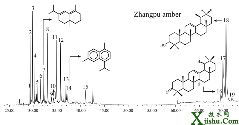 我國河南西峽和福建漳浦都具有悠久的琥珀開采歷史,其琥珀原料一直作為一味重要的中藥,因此具有重要的經(jīng)濟(jì)價值。但迄今尚未有研究關(guān)注西峽琥珀和漳浦琥珀的植物來源。近期,中國科學(xué)院南京地質(zhì)古生物研究所史恭樂博士、王博博士與印度理工大學(xué)孟買校區(qū)以及中國科學(xué)院西雙版納熱帶植物園等單位緊密合作,用氣相色譜-質(zhì)譜法測定了我國晚白堊世西峽琥珀和中中新世漳浦琥珀的萜類化合物組成。萜類化合物組成顯示,晚白堊世西峽琥珀最有可能來源于裸子植物南洋杉科,但不能排除掌鱗杉科的可能性;中中新世漳浦琥珀最有可能來源于熱帶被子植物類群龍腦香科。此前在漳浦產(chǎn)出琥珀的地層中已發(fā)現(xiàn)了大量龍腦香科的翅果和葉化石,這與漳浦琥珀生物標(biāo)志物研究得到了相互印證。
