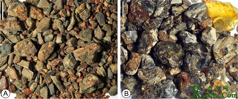 圖1. 西峽琥珀(A)和漳浦琥珀(B)