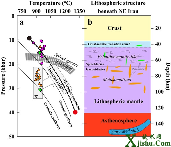 中國科學院地質與地球物理研究所特提斯研究中心蘇本勛副研究員與臺灣大學和伊朗Birjand大學進行合作,選擇伊朗境內唯一的地幔捕擄體出露點為突破口,對研究程度較低的高原東北部巖石圈地幔展開系統(tǒng)研究并得到以下幾點認識:(1)伊朗東北部巖石圈地幔主要由尖晶石二輝橄欖巖組成,輝石巖分布普遍;(2)尖晶石二輝橄欖巖變形特征明顯,具有原始地幔的成分特征,是部分熔融與地幔交代疊加的結果(圖1);(3)輝石巖顯示連續(xù)的成分變化,應為深部來源的熔體與石榴石相橄欖巖反應的產物;(4)建立了該區(qū)巖石圈結構和熱狀態(tài),其厚度至少為100km,莫霍面應在42km左右(圖2)。此項研究成果為認識伊朗高原的巖石圈結構和組成提供了重要的地球化學資料。