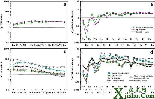 圖1 不同巖石類型中單斜輝石的微量元素特征。(橄欖巖平坦的配分形式,與原始地幔類似(a,b);輝石巖不同于橄欖巖和原始地幔,與石榴石相橄欖巖相近。)