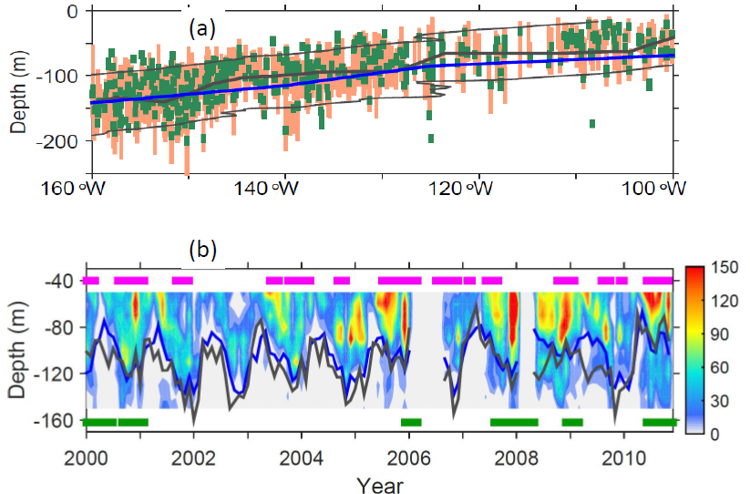 圖:(a)展示了診斷獲取的赤道東太平洋區(qū)域(3ºS-6ºN)強混合過程的發(fā)生位置(綠色)及相應的躍層范圍(棕色),其中兩條細實線表示平均的躍層范圍,粗黑實線和粗藍實線分別表示躍層中心和赤道潛流流核位置;(b)展示了診斷獲取的赤道東太平洋冷舌區(qū)(140ºW)月均的強混合過程的發(fā)生次數(shù)(顏色)。其中粗黑實線和粗藍實線分別表示溫躍層中心和赤道潛流流核位置,下部的綠色短線表示拉尼娜(La Niña)時期,上部的粉色短線表示熱帶不穩(wěn)定波(TIW)時期。