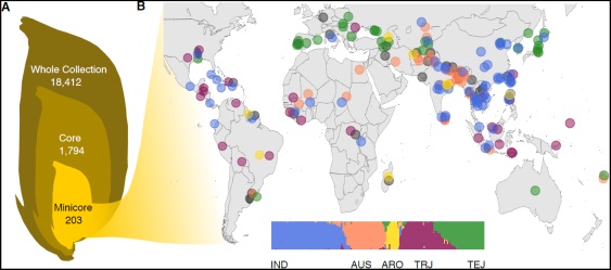 美國農(nóng)業(yè)部(USDA)種質(zhì)資源庫在過去100多年時(shí)間里,收集了全球116個(gè)國家和地區(qū)的18,000多份水稻種質(zhì)資源,并基于表型和基因型數(shù)據(jù)系統(tǒng)整理出1,794份核心種質(zhì)(core accessions),進(jìn)一步衍生出203份微核心種質(zhì)(minicore accessions),這203份微核心種質(zhì)可以很好代表全世界栽培稻的遺傳多樣性(圖1)。