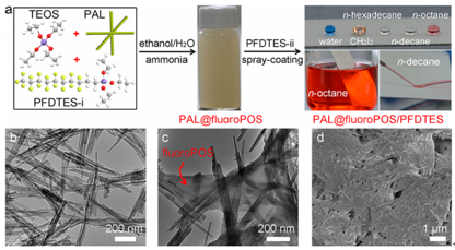 超疏水/超疏油表面在自清潔、流體輸送和防油污染等領(lǐng)域有廣泛應用前景。研究表明,纖維或棒晶狀納米材料可提高表面的超疏水/超疏油性能。在前期有機硅烷聚合物納米纖維的工作基礎(chǔ)上(Adv Funct Mater2014, 24, 1074-1080),該課題組將有機硅烷與凹凸棒石相結(jié)合,在各種材料表面構(gòu)筑了性能優(yōu)異的超疏水表面(ChemPlusChem 2013, 78, 1503-1509)。目前,超雙疏表面普遍存在低表面能有機液體(表面能≤25 mN/m)易粘附、穩(wěn)定性差、尤其是熱液體極易粘附等問題。為此,該課題組通過全氟烷基硅烷與凹凸棒石的反應,在多種基底材料上構(gòu)建了穩(wěn)定自修復低滾動角超疏熱液體表面(Chem Commun 2016, 52, 2744-2747);制備了全氟烷基硅烷/凹凸棒石磁性納米復合材料,構(gòu)建了超雙疏表面和磁控低表面能液體彈珠(J Mater Chem A2016, 4, 5859-5868.封面)。