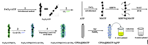 凹凸棒石棒晶束解離后,充分凸顯出一維納米材料在支撐和增韌補強等方面的應用優(yōu)勢。在凹凸棒石棒晶束解離基礎(chǔ)上,該課題組開展了不同類型改性劑對凹凸棒石表面功能化改性研究,建立了高壓均質(zhì)和改性劑協(xié)同作用提高改性效率的新方法,實現(xiàn)了應用導向的凹凸棒石表面性質(zhì)調(diào)控和功能化設(shè)計。在凹凸棒石棒晶表面負載四氧化三鐵納米粒子,采用層層自組裝或表面改性方法,制備出了磁性凹凸棒石納米復合材料,實現(xiàn)了對貴金屬的高效吸附分離及其在催化領(lǐng)域的應用(Journal of Materials Chemistry A, 2013, 1: 4804-4811;2013, 1: 7083-7090;2015, 3 (1): 281-289);通過常溫一鍋法制備了凹凸棒石/聚苯胺/銀納米粒子三元納米復合材料,該制備方法有效結(jié)合了銀納米粒子的催化特性和聚苯胺的陰離子吸附特性,既可以有效催化降解對硝基苯酚和剛果紅染料,還可以有效去除水體中的磷酸二氫根離子(Journal of Colloid and Interface Science, 2016, 473: 84–92)。