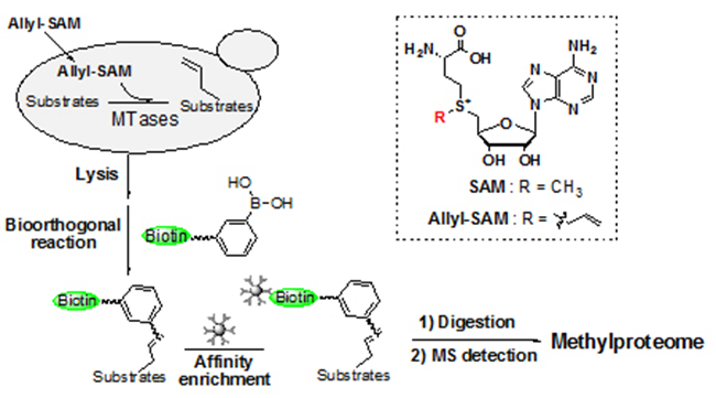 該合作團隊在前期利用烯丙基SAM體外標記蛋白質(zhì)賴氨酸甲基化底物(ChemBioChem, 2013, 14, 1438)及胞內(nèi)穩(wěn)定同位素標記全覆蓋蛋白質(zhì)甲基化修飾(Journal of Proteomics, 2015, 114, 226)研究的基礎上,提出了基于烯丙基化捕獲蛋白質(zhì)甲基化底物的化學生物學新策略。通過飼喂烯丙基SAM,使蛋白質(zhì)獲得烯丙基修飾,隨后經(jīng)生物正交反應捕獲,親和富集及質(zhì)