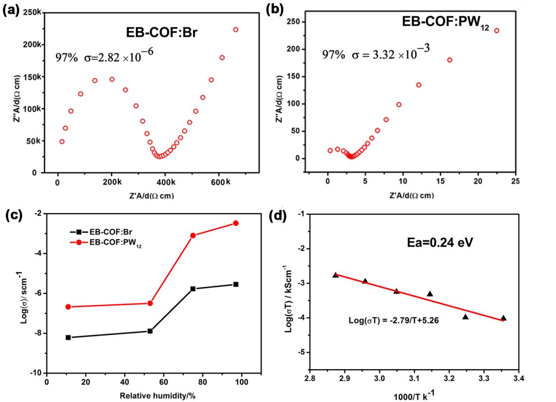 圖3:(a-c)材料在摻雜多酸后質(zhì)子傳導(dǎo)率對比圖;(d)材料的活化能。