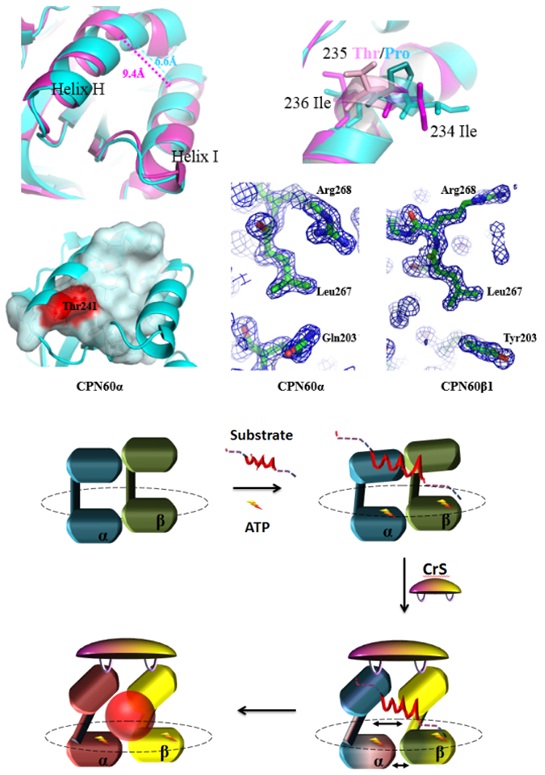 中國科學(xué)院遺傳與發(fā)育生物學(xué)研究所劉翠敏研究組經(jīng)過對衣藻不同類型的Cpn60頂端區(qū)進行篩選和比較發(fā)現(xiàn):該區(qū)不僅顯著影響分子伴侶素的ATP酶活,而且α型頂端區(qū)對RbcL的結(jié)合能力是β型的三倍,但卻只有β型頂端區(qū)能夠與輔伴侶進行有效互作。通過解析 CPN60α 和 CPN60β1 兩種類型的頂端區(qū)晶體結(jié)構(gòu)(分辨率分別為 1.75 Å 和 1.5 Å),結(jié)合大量同源序列分析,鎖定第 203,235 和 241 三個氨基酸位點。進一步研究證明了它們在亞基功能分化中的關(guān)鍵作用。同時以異源寡聚體CPN60αβ1β2為模型進行試驗,揭示了Cpn60不同亞基頂端區(qū)的協(xié)作分工雛形。以上研究成果首次凸顯CPN60α頂端區(qū)所具有的獨特優(yōu)勢,對分子層面認識并優(yōu)化葉綠體蛋白內(nèi)穩(wěn)態(tài),進而改良光合作用效率具有重要的參考價值。