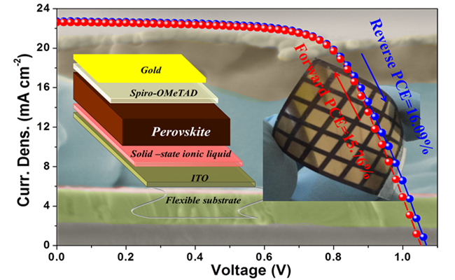 最近,該團(tuán)隊(duì)發(fā)現(xiàn)利用一種固態(tài)離子液體作為鈣鈦礦太陽能電池的電子傳輸材料可以有效提高器件的效率,還可以很好地抑制器件中的電流-電壓滯后效應(yīng),制備的柔性電池效率達(dá)到16.09%,突破了目前柔性器件的最高效率。優(yōu)異的器件性能主要?dú)w因于該離子液體具有很好的光增透作用、較高的電子遷移率和合適的能級,同時(shí)離子液體可以減少鈣鈦礦薄膜的缺陷。這一研究成果為實(shí)現(xiàn)低成本、大面積柔性鈣鈦礦太陽能電池推廣提供了切實(shí)可行的途徑。