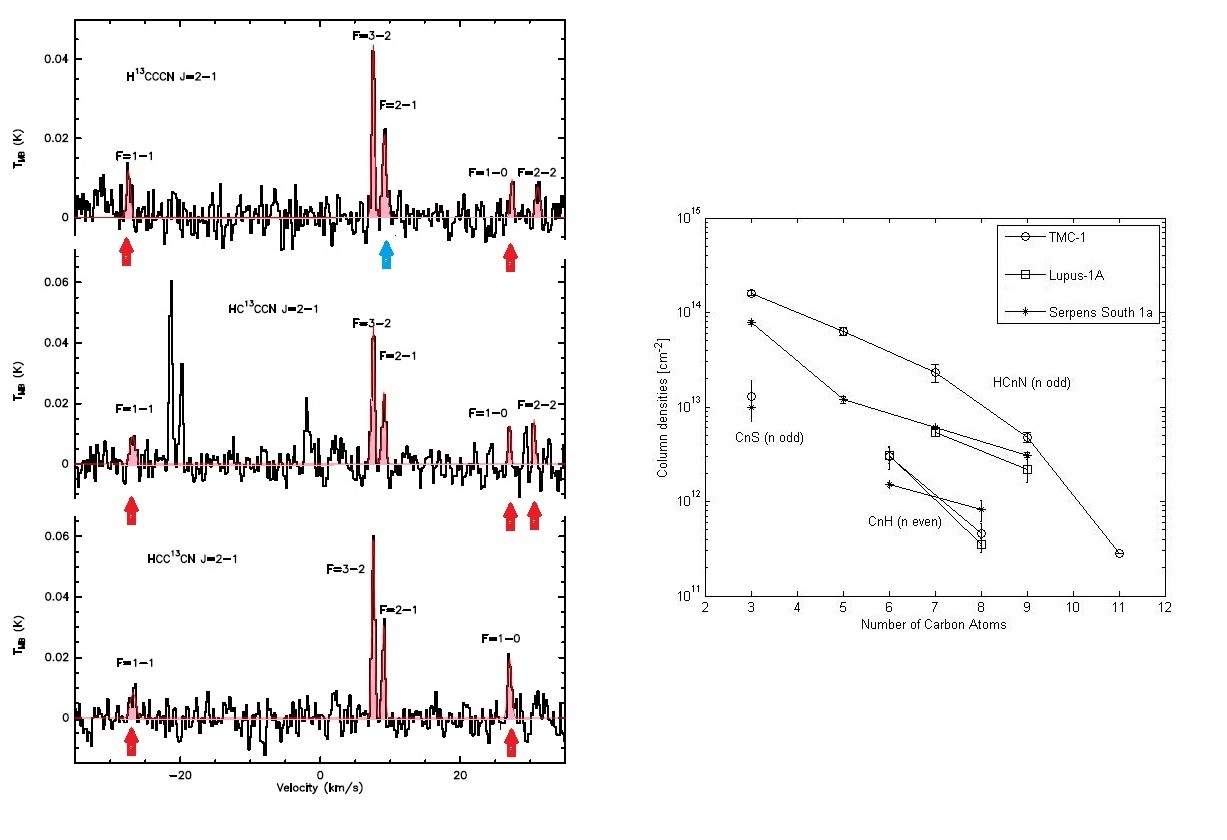 左圖:HC3N的13C同位素分子的精細(xì)結(jié)構(gòu)線,紅色箭頭標(biāo)示的是TM65m望遠(yuǎn)鏡新探測(cè)到的線,藍(lán)色箭頭標(biāo)示的是新分解開的成分。右圖: Serpens South 1a與TMC-1及Lupus-1A中碳鏈分子豐度的比較。