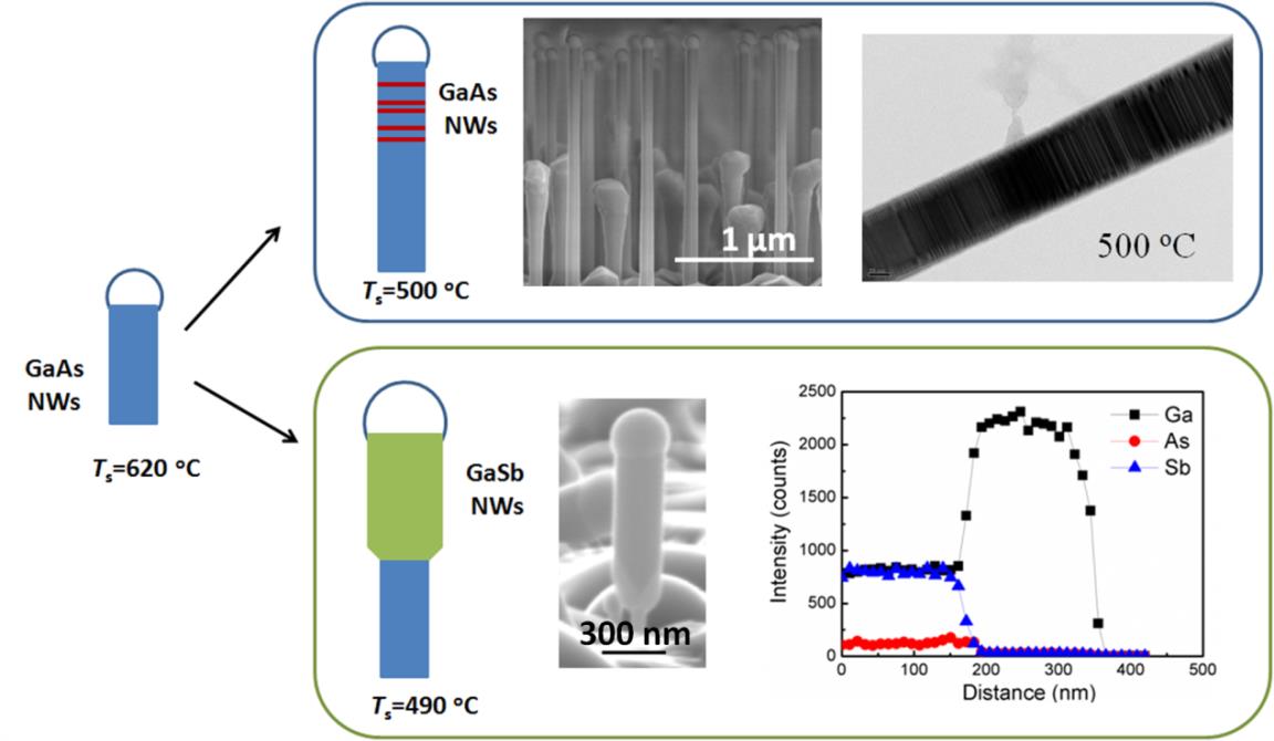 中國科學院半導體研究所半導體超晶格國家重點實驗室研究員趙建華團隊近年來一直致力于半導體低維材料的分子束外延生長,最近其團隊俞學哲博士等人在他們前期工作(X.Z. Yu et al.,Nano Lett. 12, 5436, 2012; Nano Lett. 13, 1572, 2013)基礎上,利用兩步生長方法有效擴大了Si襯底上GaAs納米線的生長溫度范圍。這是在相關工作中第一次關于Ga催化GaAs納米線的生長溫度這一重要晶體生長參數(shù)的深度研究,而之前由于一步生長法的限制,GaAs納米線只能生長在一個很窄的溫度范圍。在此基礎上,他們利用Ga催化率先制備了GaAs/GaSb軸向異質結納米線,并且通過摻入適當As,合成了組分可調的GaAs/GaAsSb軸向異質結納米線,使能帶工程在GaAsSb納米線中得到應用。