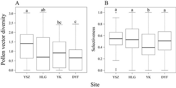 植物特化水平指數(shù)在不同群落間的比較。A:植物的傳粉者多樣性;B:植物選擇性。