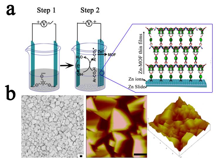此前,該研究團隊利用原位生長方法構筑金屬-有機框架薄膜,探索了薄膜的傳感與傳輸性能(Langmuir,2013, 29, 8657)、抗菌性能(Adv. Mater. Interface, 2014, 2, 1400405),采用電化學方法成功制備了金屬-有機框架薄膜,并探索其在傳感方面的應用(J. Mater. Chem. A, 2014, 2, 19473);同時,采用電化學輔助微波合成法,優(yōu)化了電化學生長方法,成功制備了鑭系金屬-有機框架薄膜(Chem. Commun., 2016, 52, 3951),拓展了金屬-有機框架薄膜的制備方法和開發(fā)了金屬-有機框架膜的潛在應用。