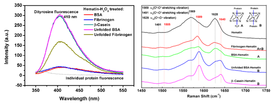 左圖:不同結(jié)構(gòu)蛋白發(fā)生不同程度雙酪氨酸聚合的熒光光譜表征;右圖:不同結(jié)構(gòu)蛋白與血紅素不同配位狀態(tài)的Raman光譜表征。