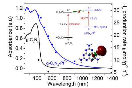 廣譜光催化分解水制氫是近年來(lái)業(yè)界一直期望解決的難題。熊宇杰課題組先前基于貴金屬納米結(jié)構(gòu)的等離激元效應(yīng),通過(guò)形成貴金屬和半導(dǎo)體的異質(zhì)結(jié)構(gòu),將等離激元效應(yīng)中的熱電子注入、共振傳能和電磁場(chǎng)增強(qiáng)等作用機(jī)制引入到半導(dǎo)體的帶間躍遷過(guò)程中,在廣譜光解水制氫方面取得了一系列成果(Adv. Mater. 2015, 27, 3444; Nano Energy 2016, 24, 87; Small 2016, 12, 1640)。盡管這種技術(shù)途徑在光催化性能方面取得了顯著提高,然而其貴金屬用量較大,無(wú)法降低催化劑的材料成本。因此,研究人員基于低成本的有機(jī)半導(dǎo)體材料,將配位化學(xué)與光催化技術(shù)相結(jié)合,提出了一種新的廣譜光催化作用機(jī)制。