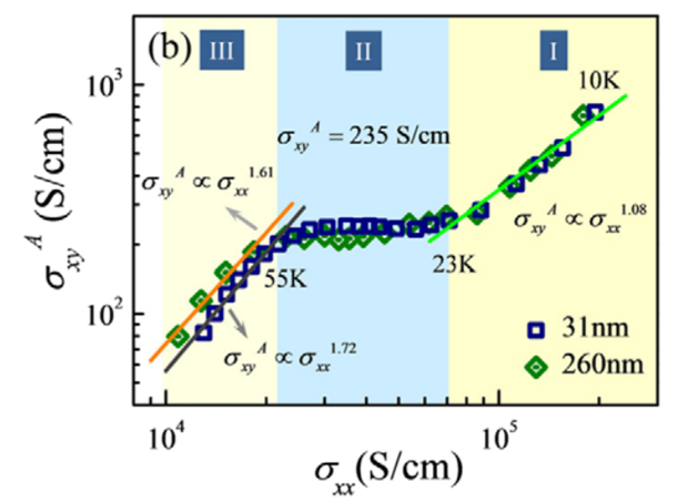 另外,在對Sr4Ru3O10反常霍爾效應(yīng)的標度分析中還發(fā)現(xiàn),其反;魻栃(yīng)包含三個不同的區(qū)域,分別對應(yīng)φ=1,0和1.6。這三個區(qū)域都是理論上通過考慮不同自旋散射機制所預(yù)期的,但是很少能在同一個樣品中同時被觀測到。該發(fā)現(xiàn)反映出Sr4Ru3O10中具有不同尋常的自旋散射機制。