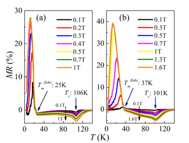 不同厚度的Sr4Ru3O10納米薄片在不同磁場下的磁阻溫度變化曲線?梢娖滂F磁轉(zhuǎn)變溫度Tc基本保持不變,而其變磁轉(zhuǎn)變溫度Tmflake卻嚴重地受到厚度的調(diào)制。