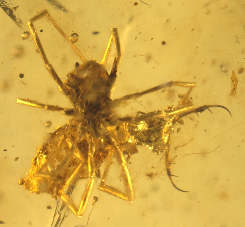 緬甸琥珀中蟻蛉總科幼蟲利用砂粒、土壤塵粒、各類植物碎屑、碳化的植物莖稈碎片;獵蝽幼蟲利用土壤塵粒、各類植物碎屑。偽裝物分析結(jié)果表明這些昆蟲主要棲息于地面表層,這些偽裝物不僅減弱了蟲體與背景差異(視覺偽裝),可能也掩蓋了蟲體的氣味,提供了化學(xué)偽裝。該研究也首次發(fā)現(xiàn)蜘蛛捕食蝶角蛉幼蟲的化石,提供了已知最古老的蜘蛛捕食的直接證據(jù)。
