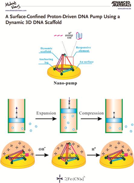 分子級別的納米泵在生物體內(nèi)發(fā)揮著重要的生物學功能,如細胞內(nèi)外水分子的輸運以及離子的輸運等。模擬并構建納米泵及其功能實現(xiàn)是納米技術領域的重要挑戰(zhàn)之一。DNA納米技術為解決這一挑戰(zhàn)性問題提供了可能。上海應物所樊春海團隊基于DNA納米技術發(fā)展了三維、動態(tài)DNA納米結(jié)構,并對DNA納米器件以及生物分子的界面可控組裝開展了系統(tǒng)的研究(Acc. Chem. Res.2010, 43, 631; Acc. Chem. Res. 2014,47, 550)。之前,通過DNA分子自組裝發(fā)展了剛性的DNA四面體納米結(jié)構并實現(xiàn)了界面可控組裝,并實現(xiàn)了基于三維DNA納米結(jié)構界面的電化學生物傳感(Adv. Mater. 2010, 22, 4754;Angew. Chem. Int. Ed. 2015, 54, 2151)。針對納米泵問題,研究員左小磊通過與樊春海、胡鈞等的合作,充分利用DNA納米結(jié)構精確可調(diào)的特點,構建了一種質(zhì)子響應性的動態(tài)DNA四面體納米結(jié)構,該納米結(jié)構可根據(jù)溶液的pH的變化進行循環(huán)往復的結(jié)構變化。通過精確界面組裝技術將該結(jié)構組裝到金界面上,他們實現(xiàn)了質(zhì)子驅(qū)動的DNA納米泵,該納米泵可用于驅(qū)動水分子以及離子的定向運動。這種三維、動態(tài)以及有序的界面在生物傳感、邏輯器件以及合成生物學中具有重要的應用潛力。
