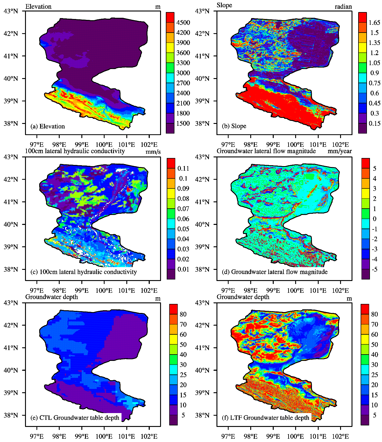 黑河流域(a)高程, (b)地形坡度, (c)100厘米土壤層側(cè)向水導(dǎo)率和(d)地下水側(cè)向流流量的空間分布,以及(e)不考慮地下水側(cè)向流和(f)考慮地下水側(cè)向流情況下地下水位埋深的空間分布
