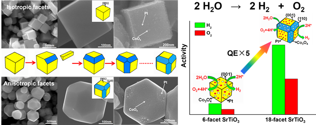 該團隊以立方相的SrTiO3作為模型,可控合成了單一晶面的六面體SrTiO3和暴露不等同晶面的十八面體SrTiO3。研究發(fā)現(xiàn)對于六面體單晶(暴露六個等同晶面),無法實現(xiàn)晶面間光生電荷的分離,而將形貌調(diào)變至十八面體時,光生電子和空穴則分別有效地分離至不同晶面上,實現(xiàn)了光生電荷的空間分離。將氧化和還原助催化劑選擇性地生長在不同晶面上,不僅實現(xiàn)光生電荷在不同晶面間的分離,而且使氧化和還原反應(yīng)位在空間上隔離,促進光催化分解水制氫活性可提升5倍以上。該工作發(fā)展了晶面間光生電荷分離理論,從原理上為實現(xiàn)高效光催化分解水提供了新的策略。