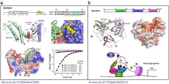 a:組蛋白H3.3K36me3被ZMYND11串聯(lián)Bromo-ZnF-PWWP結(jié)構(gòu)域識別;b:組蛋白H3“K4me3-R8me2a”被Spindlin1串聯(lián)Spin/Ssty結(jié)構(gòu)域組合識別。