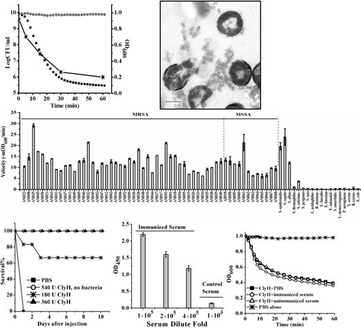 危宏平研究團(tuán)隊(duì)利用噬菌體天然的進(jìn)化和選擇優(yōu)勢(shì),通過(guò)噬菌體殺滅靶細(xì)菌的武器——裂解酶來(lái)對(duì)抗日益嚴(yán)重的MRSA耐藥性問(wèn)題。該團(tuán)隊(duì)在充分研究噬菌體裂解酶結(jié)構(gòu)的基礎(chǔ)上,通過(guò)功能域重組的方式構(gòu)建了一個(gè)全新的靶向金黃色葡萄球菌的嵌合裂解酶ClyH,在大腸桿菌中表達(dá)純化后具有高效裂解金黃色葡萄球菌的活性,比溶葡菌素高4-10倍。體外試驗(yàn)表明,ClyH能在幾分鐘內(nèi)快速裂解所有測(cè)試的臨床MRSA菌株。小鼠試驗(yàn)顯示ClyH對(duì)MRSA感染的小鼠具有明顯的保護(hù)效果。該新型裂解酶也在體外顯示出來(lái)了清除MRSA生物膜的良好效果。這些研究表明新型嵌合裂解酶ClyH具有高效裂解MRSA的活力,為研制預(yù)防和治療MRSA及其生物膜引起的感染藥物提供了新的靶標(biāo)分子。該研究受到科技部“973”計(jì)劃項(xiàng)目的資助。